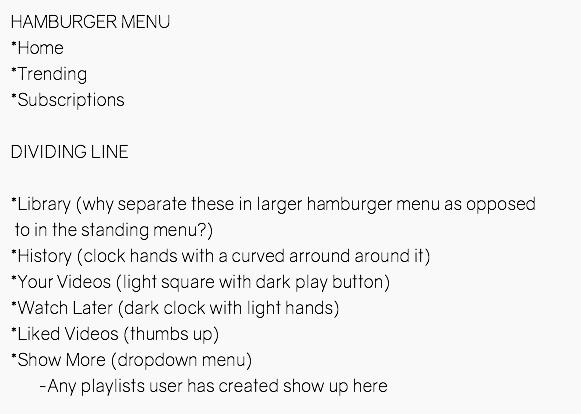 Upon first glance, there were a couple questions I had. In the menu that appears when you first open the page, the options for Home, Trending, Subscriptions and Library are grouped together, but in the deeper expanded hamburger menu, the Library option is grouped instead with 'History' 'Your Videos' 'Watch Later' and 'Liked Videos'. I found this interesting at first but then after going back to the website and following the buttons, it made more sense.